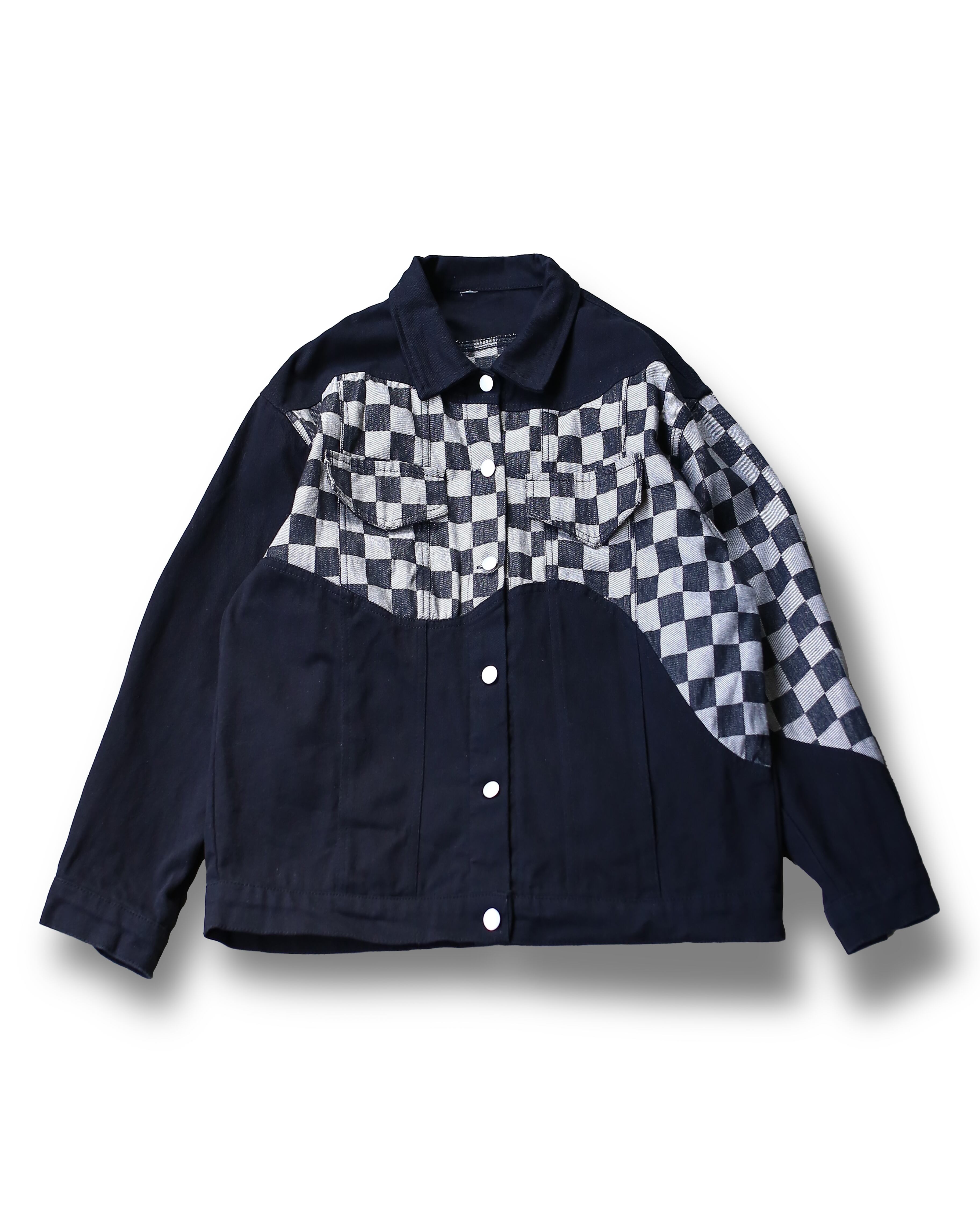 CHECKER FLAG PATTERN BLACK DENIM JACKET / チェック ブラック デニム ジャケット