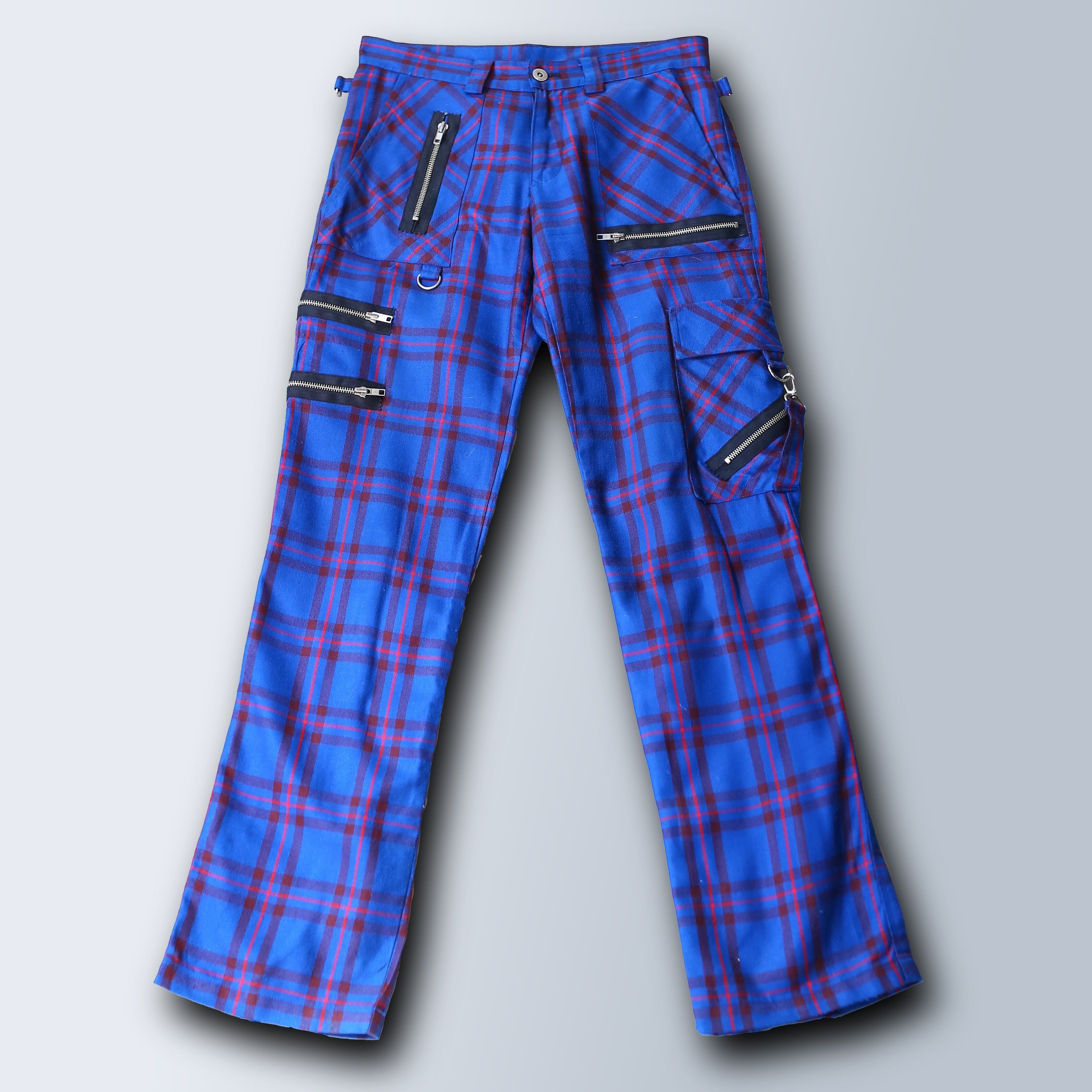 BLUE CHECK PATTERN BONDAGE PANTS / パンク チェック 総柄 ボンテージ パンツ