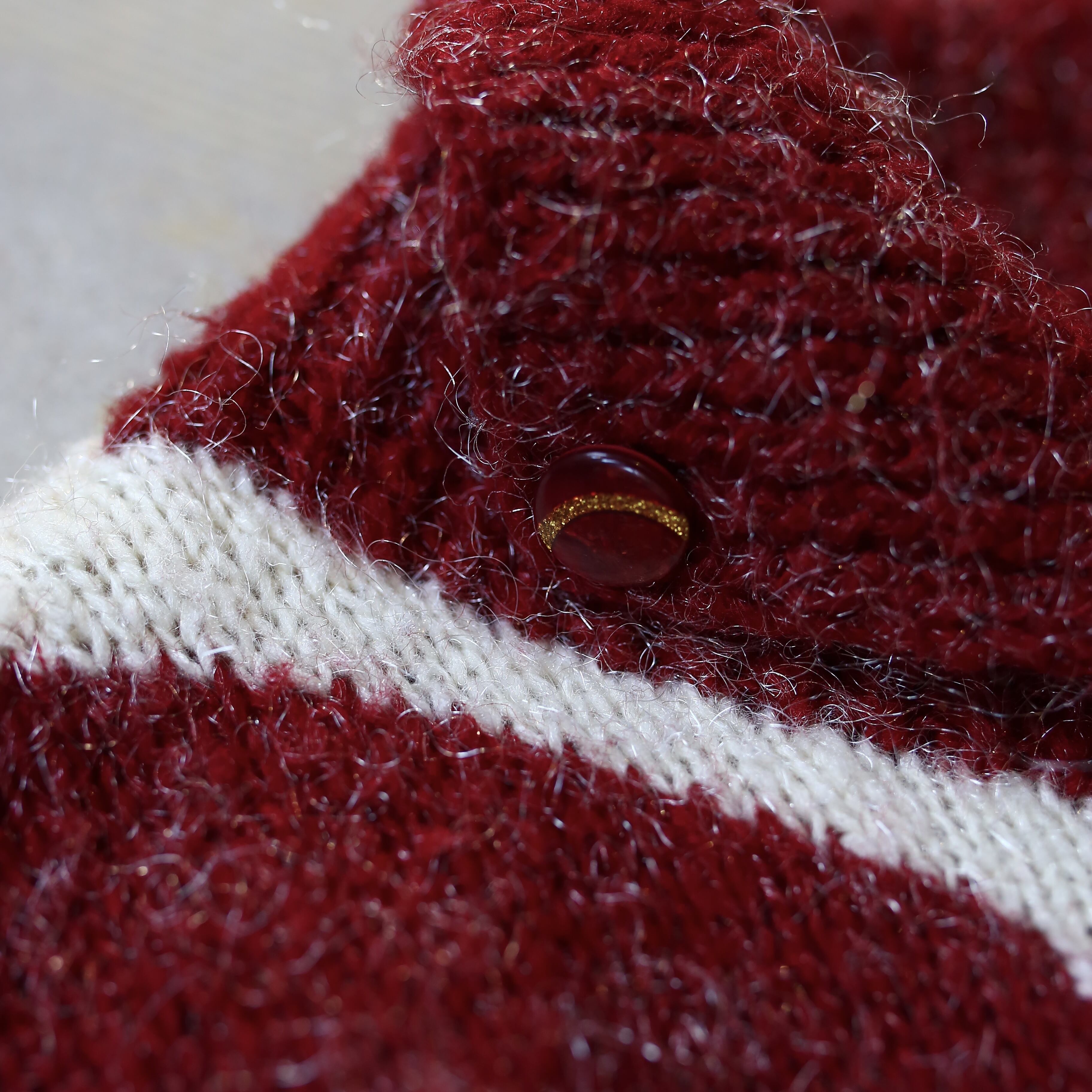 メタリックな糸も織り混ぜ、ボタンもオリジナルで