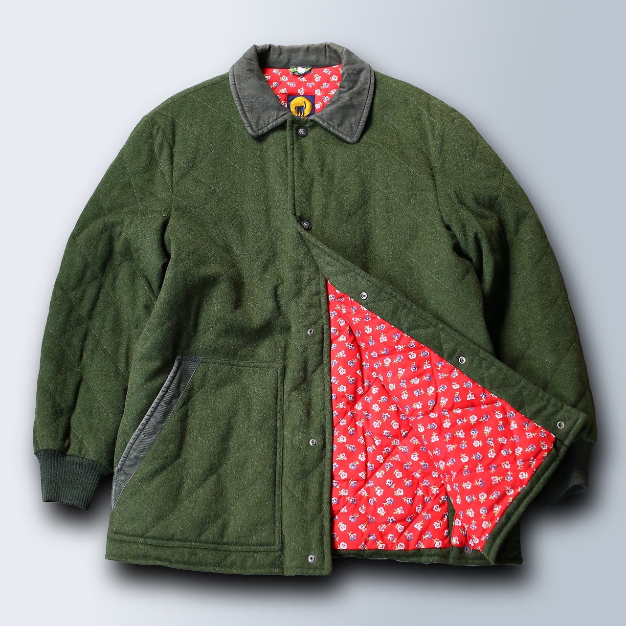 オリジナルのボタンに襟はコーデュロイ切替。